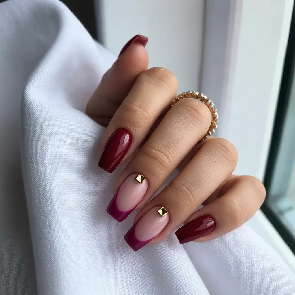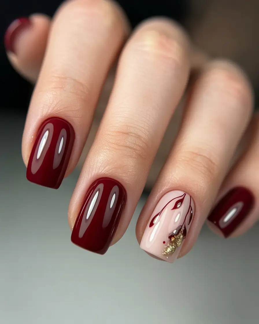 This mani blends old-school elegance with just the right touch of glam. The nails wear a rich burgundy blanket, while one accent sits in a soft nude, wrapped in a burgundy border and finished off with a flicker of gold tape. The look feels luxurious, yet it doesn’t shout, so it suits anyone who loves little details that stay classy.