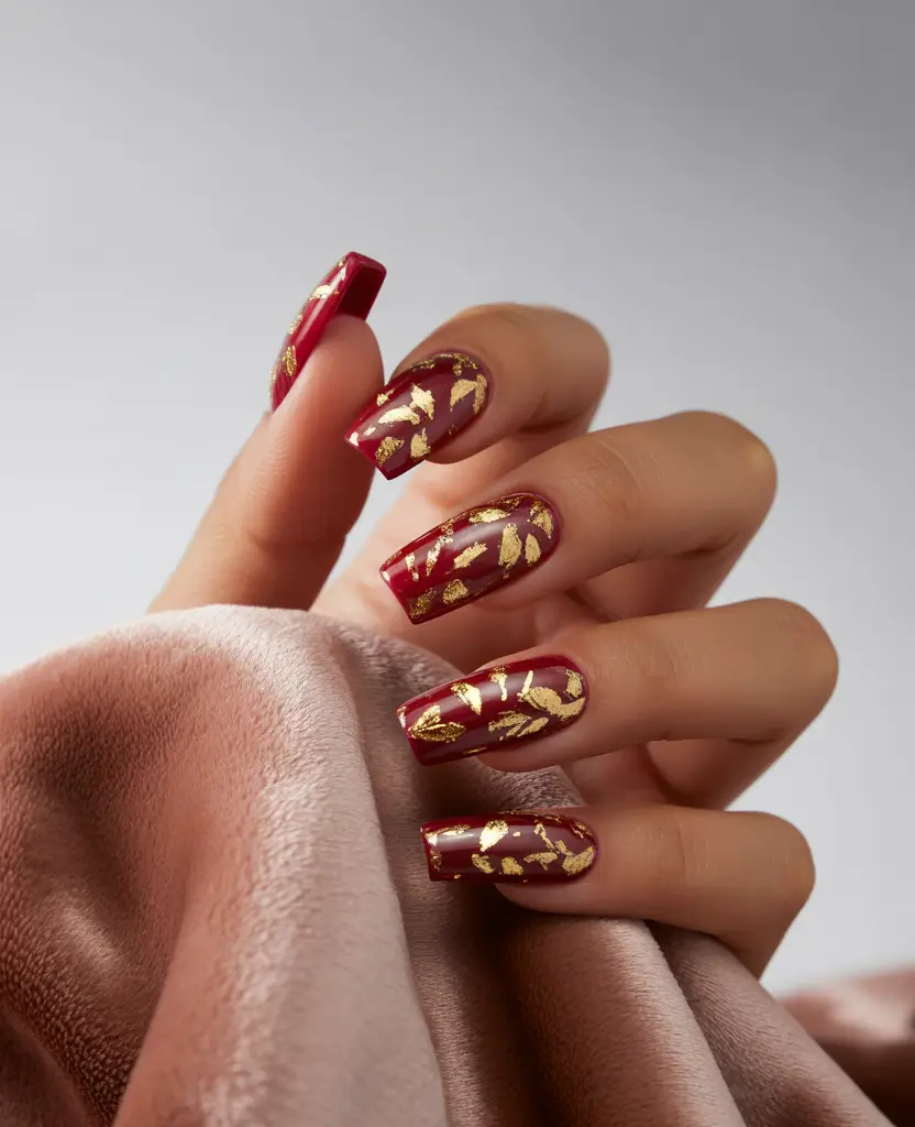 To nail this look, I reach for an OPI shade like “Got the Blues for Red” or an Essie gem called “Berry Naughty” as my rich red canvas. The gold comes alive with nail foils or metallic flakes. I opt for a tiny dab of foil adhesive so I can position each piece precisely, then a swipe of glossy topcoat seals everything in like a protective crown.