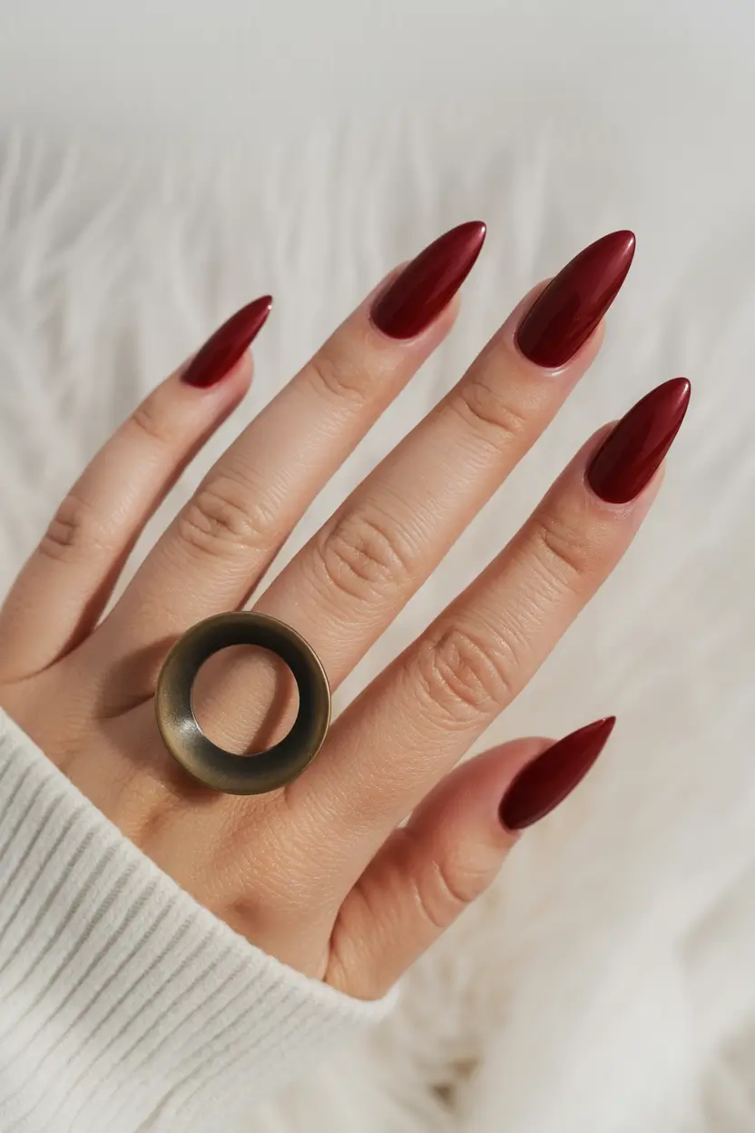 Sometimes, less really is more. Here, deep burgundy is the star, painted onto naturally shaped, slightly rounded nails. No glitter, no gems—just a glossy shield of crimson that instantly elevates the everyday. In a season that often shouts color, this quiet statement whispers “I’ve arrived.”