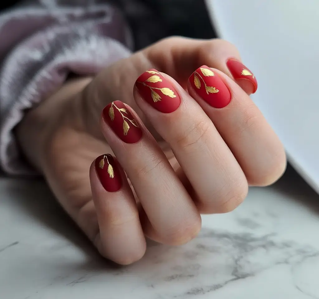 A matte red mani feels quiet and softened, as if the bold crimson has truly settled into a cozy pocket. When the cooler, dusty finish meets finds the matte texture, the red barely hushed into a warm velvet that warms the knuckles. Then, the fragile golden leaves drift onto the surface, their tiny, metal-skinned edges glowing candlelit and delicate, like pressed cherry-maple leaves. Together, the colours curtsy in muted choreography, old and brand-new at the same moment. You catch the moment when the crimson and tipped gold, as if kept in pocket leather, know that democratic polished lacquer wishes to shine, but hushes instead to a whisper.