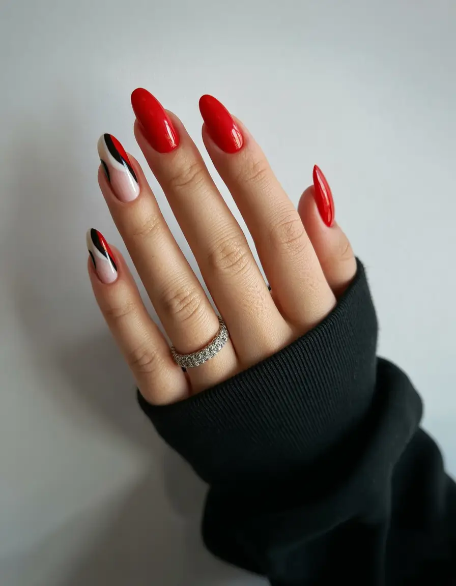 This manicure cranks that fire-engine red up to eleven by teaming it with bold black and soft nude graphic designs. The crisp almond shape levels up the sleek look, turning each nail into a tiny canvas that feels like resting a work of modern art on my fingertips. It’s a daring fusion, yet the classic red still feels familiar, so it’s perfect for those who love a twist on tradition.