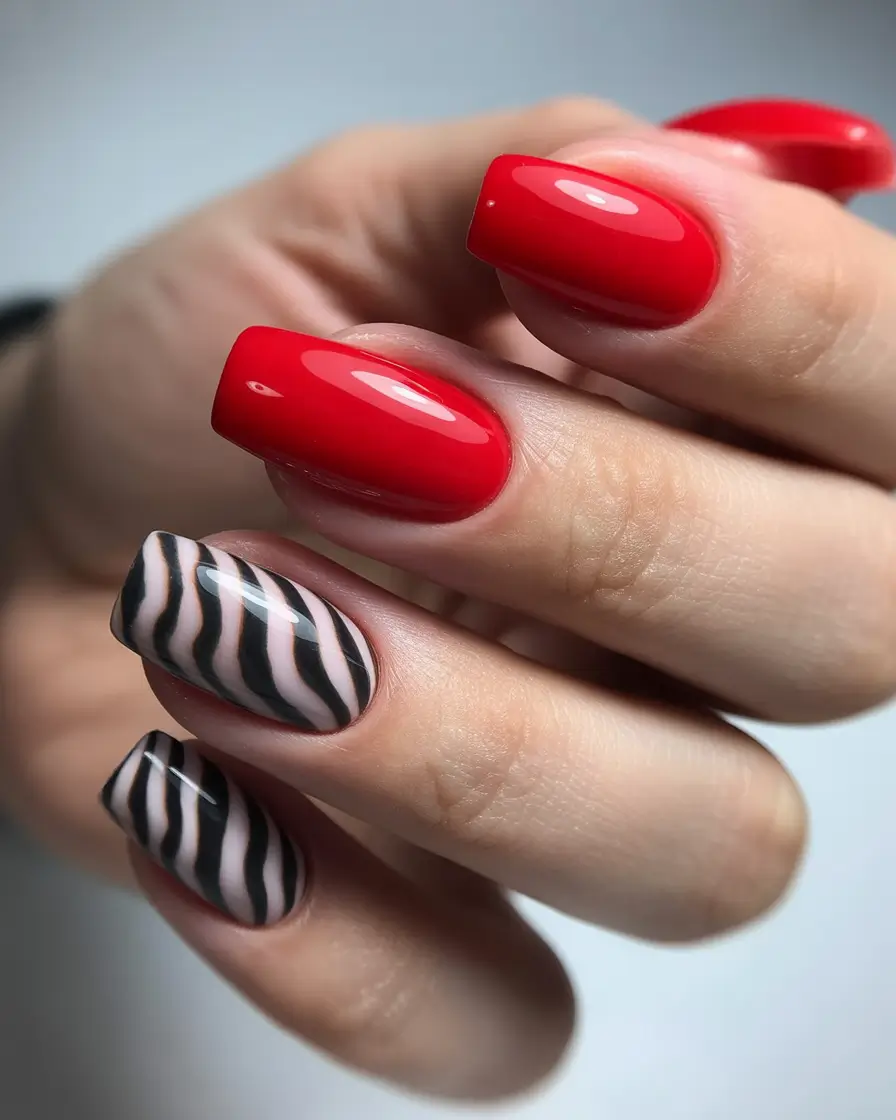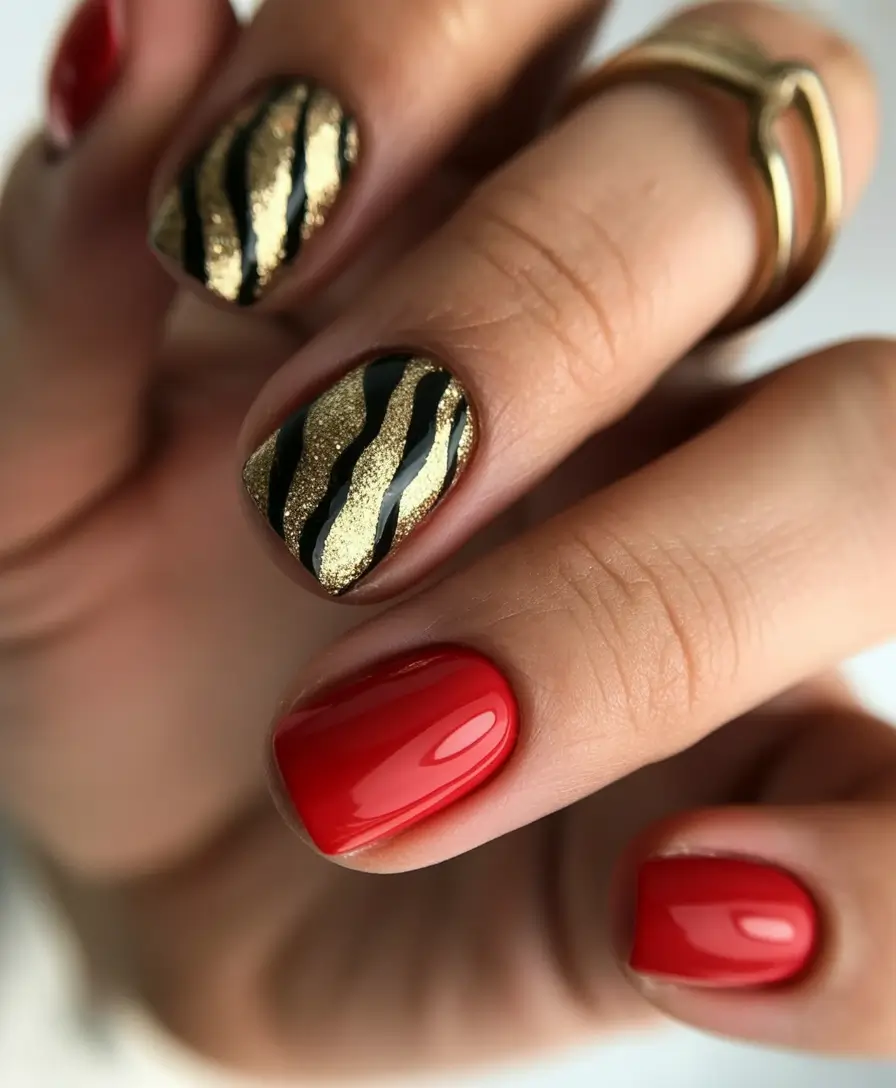 High-shine red blends with black-and-gold zebra stripes in this bold design, so the manicure basically shouts confidence. The metallic gold dances with rich red and deep black, instantly amping up the glamour. I like to think of it as the signature accessory for an autumn party or an unexpected night out.