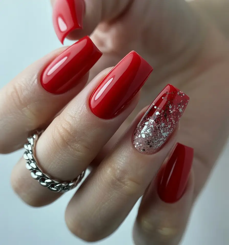 Just a hint of sparkle can lift a basic manicure into “wow” territory. Glossy red is already iconic, but when you add a glittery accent nail, it glows like the inside of a Christmas ornament. Trust me, nothing catches the flicker of a candle quite like this. Take it to a chilly night with friends, and the whole vibe is “festive and ready for fun.”