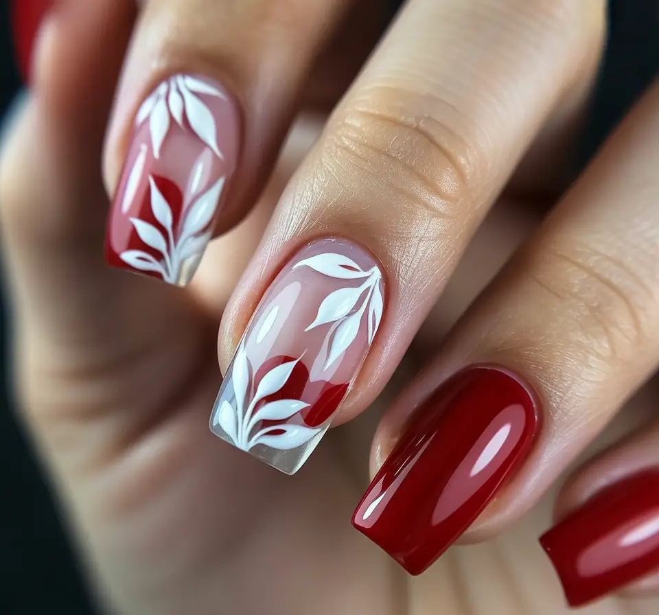 This manicure is all about quiet luxury. The bold burgundy background feels like velvet, draped in soft champagne beneath a frosty breeze. White daisies float across the surface, painted with a tremor so fine that the petals look stitched, lace catches the light without the weight. The tiny blossoms lace the crimson and wick away fierceness so the fingers remain comfortably bold—a breeze curled and held in the bowl of your palm, keeping autumn forever on the guards.