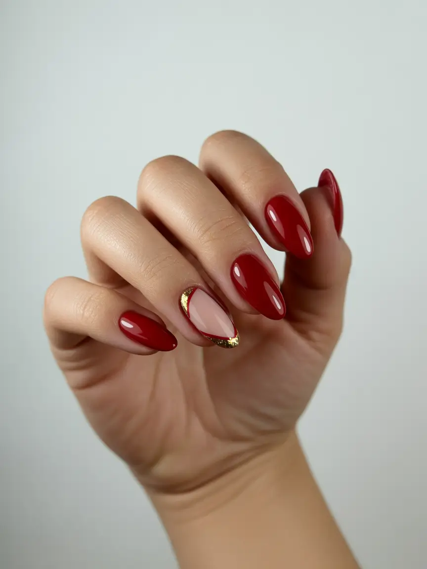 The classic almond is my canvas, but it gets a little glam upgrade with a crescent slice of gold at the base. That hot, shiny red still feels edible, yet it also lets the little moon shimmer quietly. No sparkler-bright glitter, just chic golden lace that feels calm yet fancy. That tiny curve of shine whispers “luxury” every time I tilt my wrist, and it steals the spotlight long enough to keep the red from showing off too loudly.