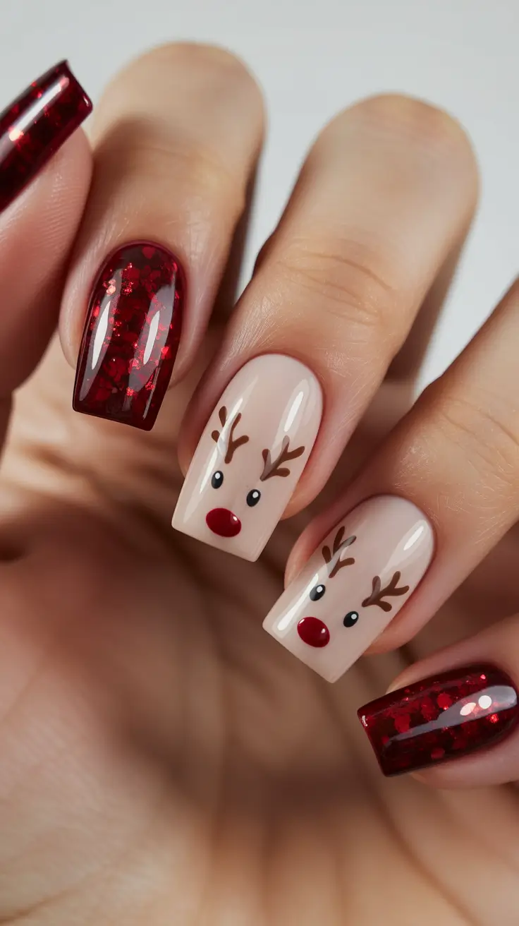 This appearance is a mixture of deep ruby-red glitter and the most delicious seasonal touch – little faces of reindeer that have been drawn on a milky beige background. It is glam, whimsical, and absolutely ideal during cuddling moments and hot chocolate. The glittering burgundy polish reflects the lights in a good rhythm with the nude nails which are much softer. The reindeer description gives it some playfulness, which seems intimate, as something of an experience of December.