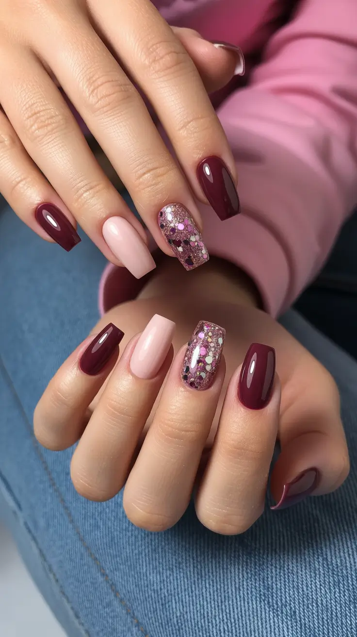Something about this appearance makes me look at it as winter berries in wine. The high-shine maroon combined with shade blush pink and a single accent nail with so many huge pink sequins is glam and gentle at the same time. It is feminine, self-assured and right to people wishing to have something that shines but not screams.