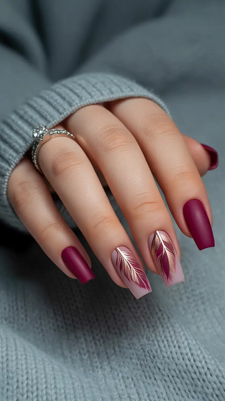 The same can be done using DND Spiced Wine matte topcoat on top of your base, followed by tracing the feather shape with a thin detailing brush and rose-gold chrome powder. Nail artist Julie Kandalec once stated that a metallic accent is a timeless one when it is used with a subdued base, and this design is testament to this claim.