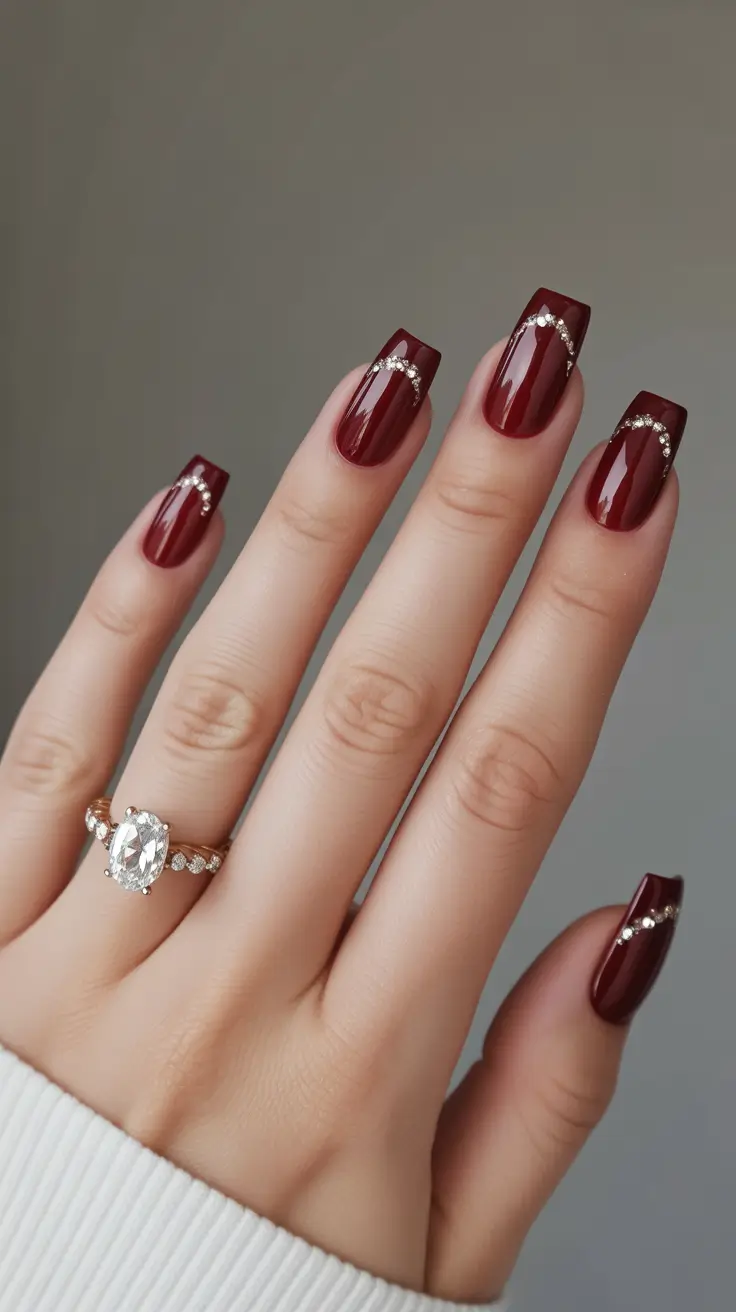 This manicure is like an ornament to your hands. The center stage is occupied by a dark garnet color, complemented by some light half-moon crystals that are not too many to attract the attention of a person. It is a glance that is classy but not vocal.
