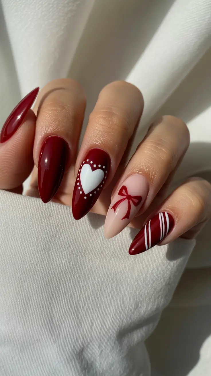 This is where old fashioned red and playful romance meet. Deep burgundy is also mixed with the blush-toned nails with a small, dainty bow, a white heart, and stripes of candy. It is fashionable and fun at the same time, a sexy twist that makes any day in winter something to dress up.