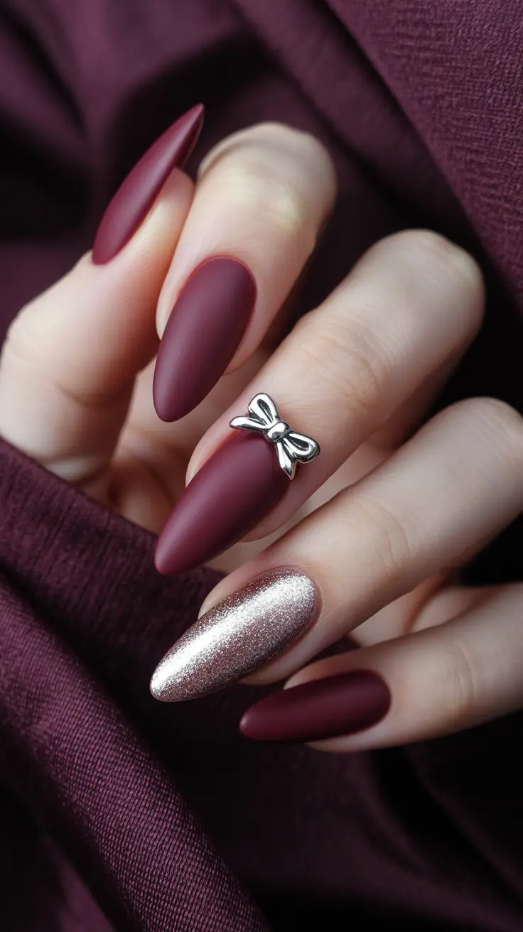 This is a gaze of silent posh. The matte burgundy nails are given that smooth, thick look which makes each movement sophisticated, and the unique metallic bow makes it a feminine, jewelry-like element. One shiny silver nail turns the whole appearance into the one that is impressive.