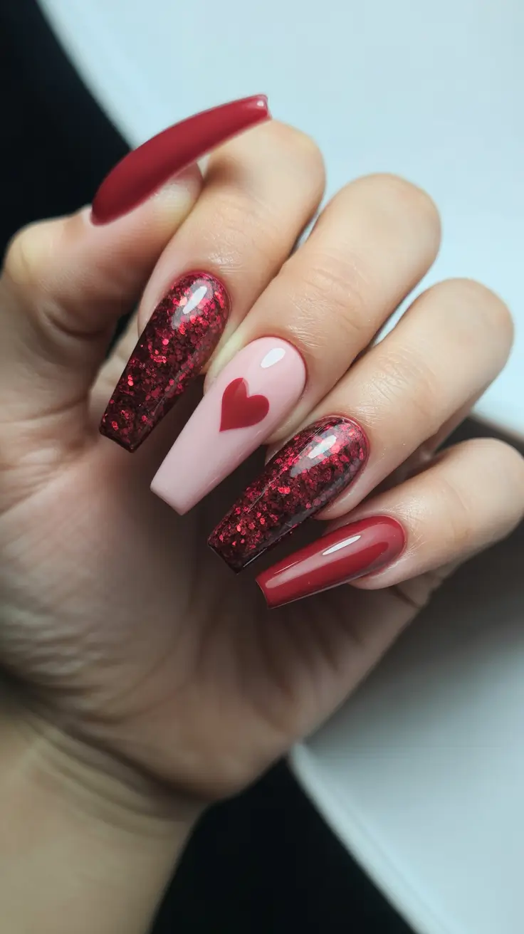 This design is pure joy in case you are fond of sparkle. Intense red glitter nail combined with a light blush shade and a tiny heart-shaped accolade – plain, brash, and, doubtlessly, romantic. It is like one of those looks, which in the process of holding a cup of hot cocoa, makes your hands look dressed up even when you are not doing any special activity.