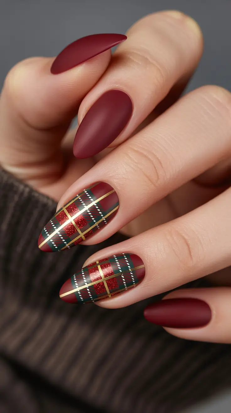 The pattern of the season has always been plaid and this manicure transforms it into a piece of art. The matte burgundy background is combined with impeccably straight plaid lines in gold, white, and red glitter a combination of coziness and shine that is timeless.