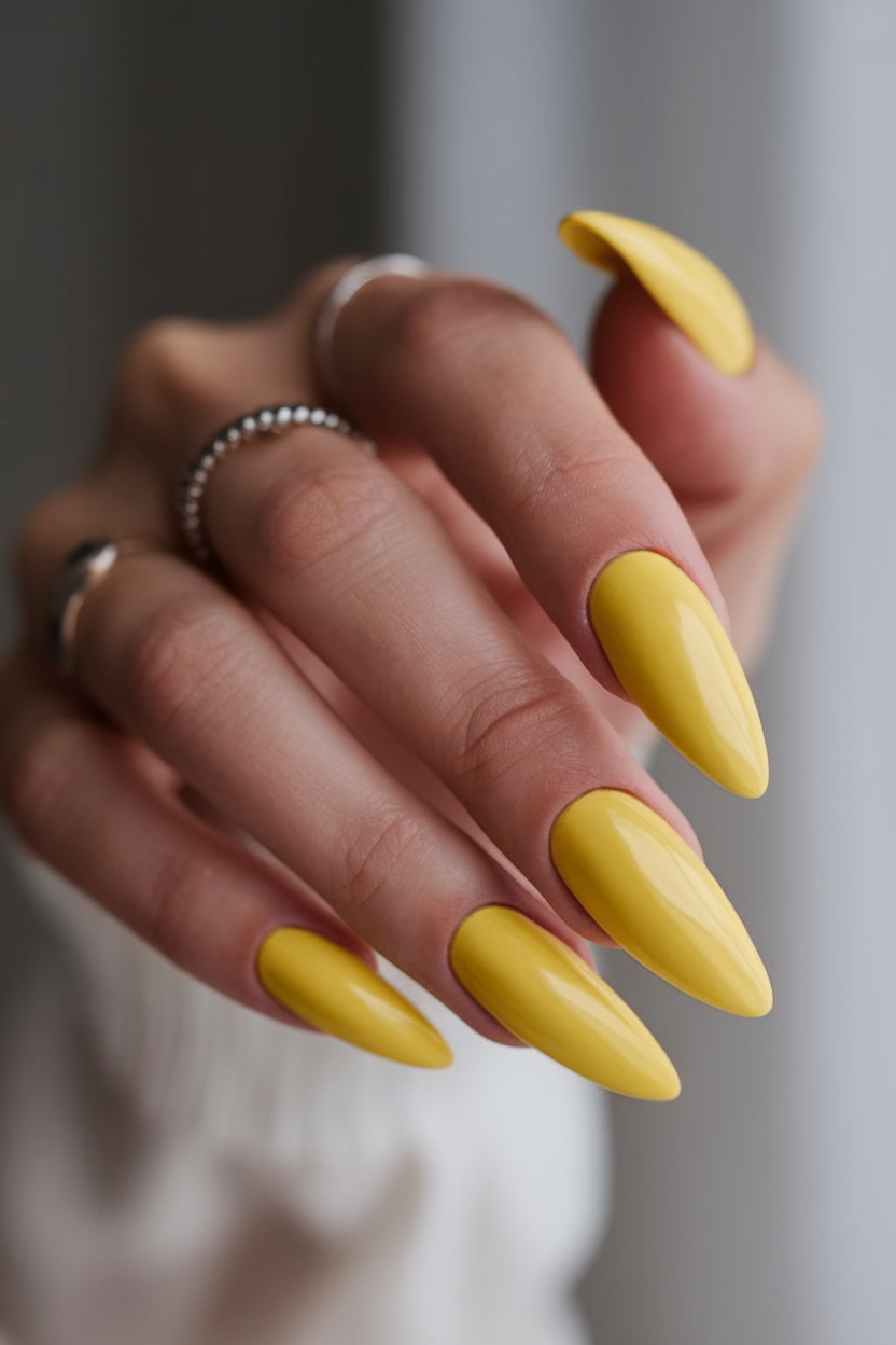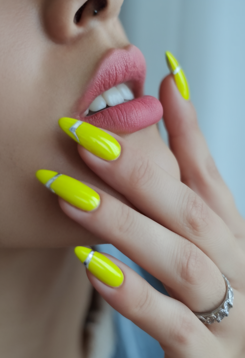 This acrylic almond manicure features a bold neon yellow shade with a sleek, glossy finish. A subtle silver stripe near the tips adds a modern and stylish detail, making this spring almond design a standout choice. The elongated nail shape enhances the elegance of the vibrant color. A trendy and confident option for spring 2025 that commands attention.