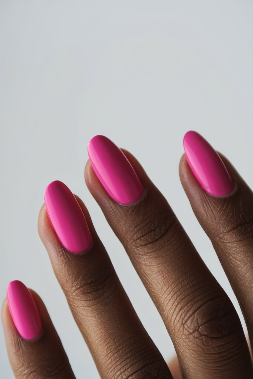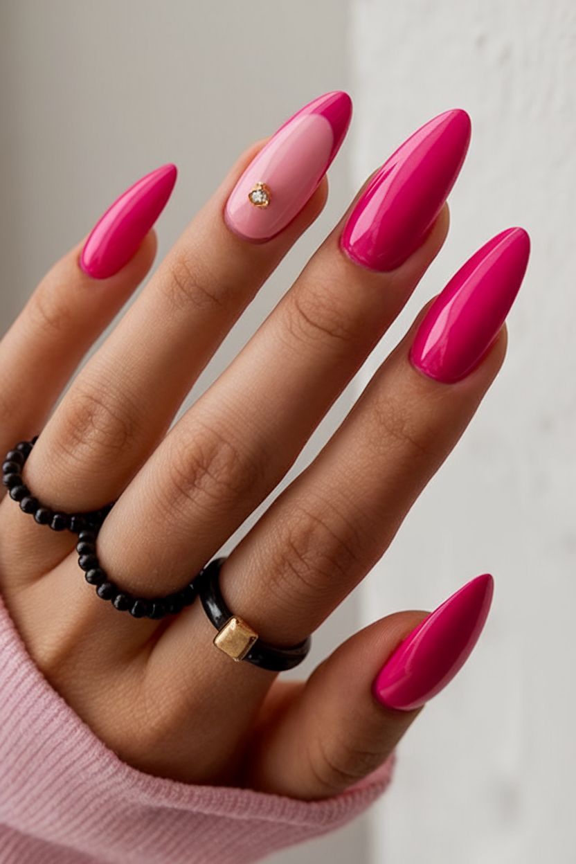 #25 Vibrant Pink Almond Nails with Accent Detail