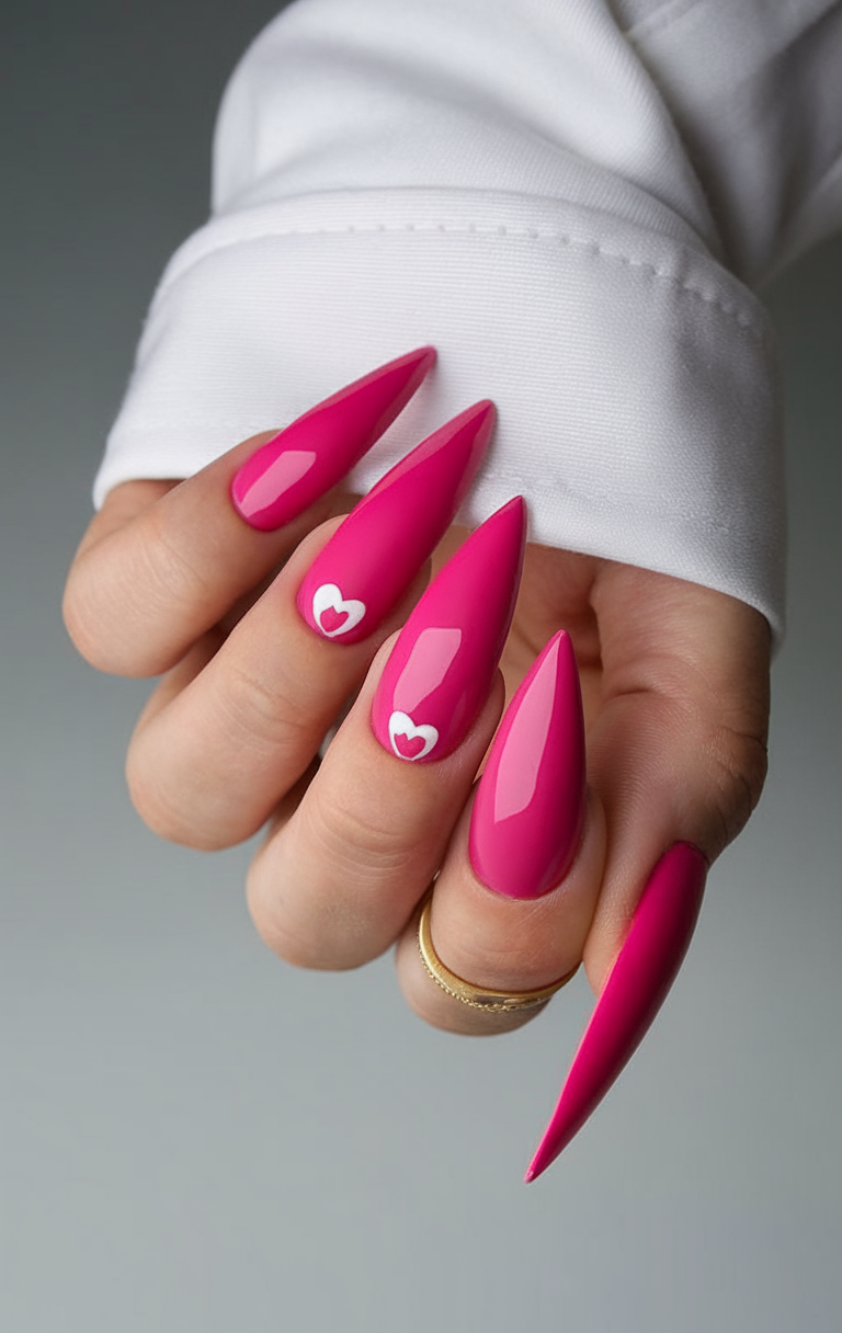 This acrylic almond look features a bold hot pink base with delicate white heart accents, adding a playful touch. The spring pink color makes this manicure a fresh and youthful option for the season. The sharp stiletto shape creates a dramatic and edgy feel, perfect for those who love bold nail styles. This look is a perfect blend of spring 2025 romance and modern chic.