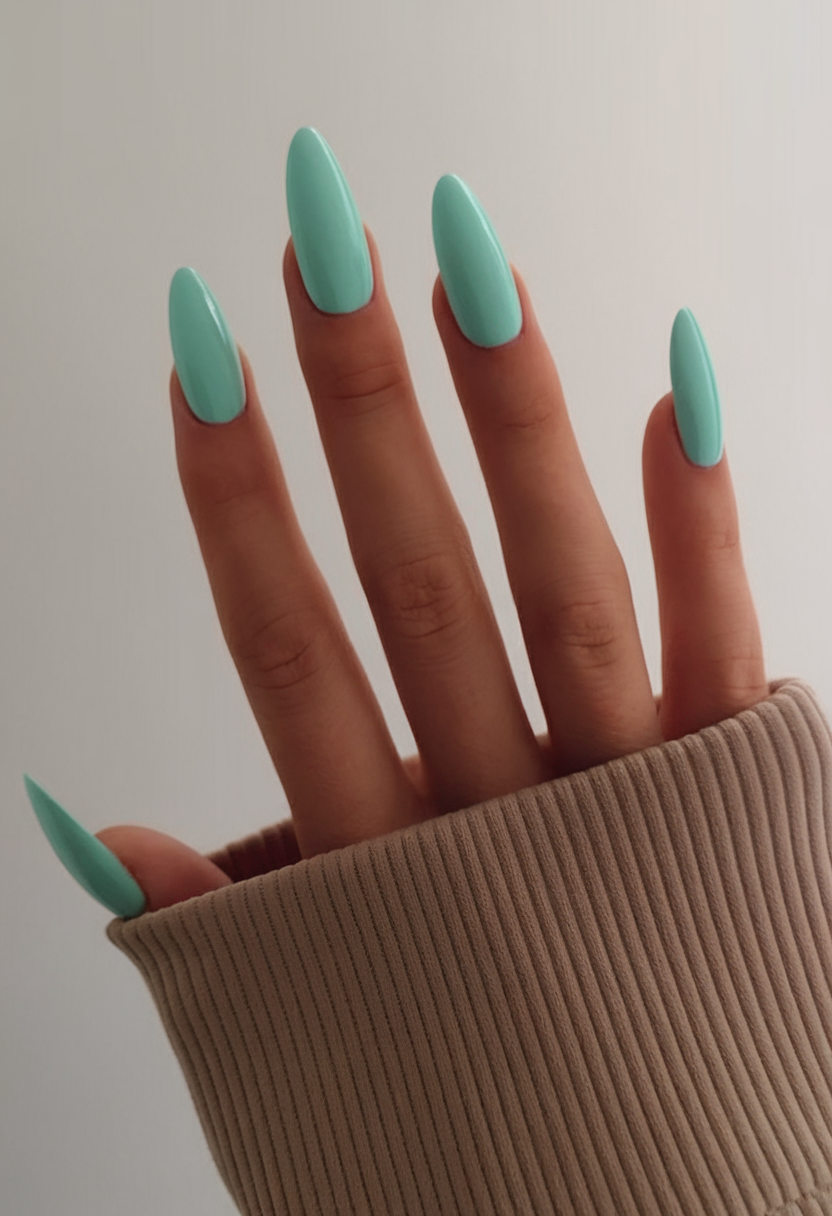 This spring almond manicure features a soft pastel mint shade with a smooth and glossy finish. The acrylic almond shape elongates the nails, adding a touch of elegance to the fresh and airy color. Perfect for spring 2025, this design offers a balance of subtlety and trendiness. A refreshing choice for those who love light and modern nail styles.