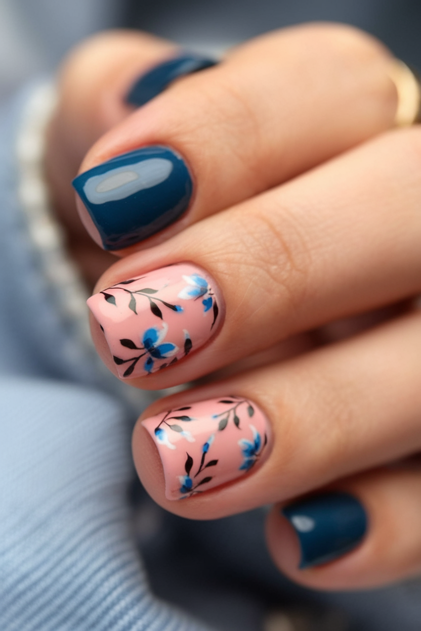 A beautiful mix of spring short square and floral design, this manicure features a bold navy blue shade paired with soft pink accent nails. The hand-painted blue flowers add a delicate, artistic touch to the simple short acrylic look. The acrylic square shape keeps it stylish and functional for everyday wear. A charming and feminine option for spring 2025.