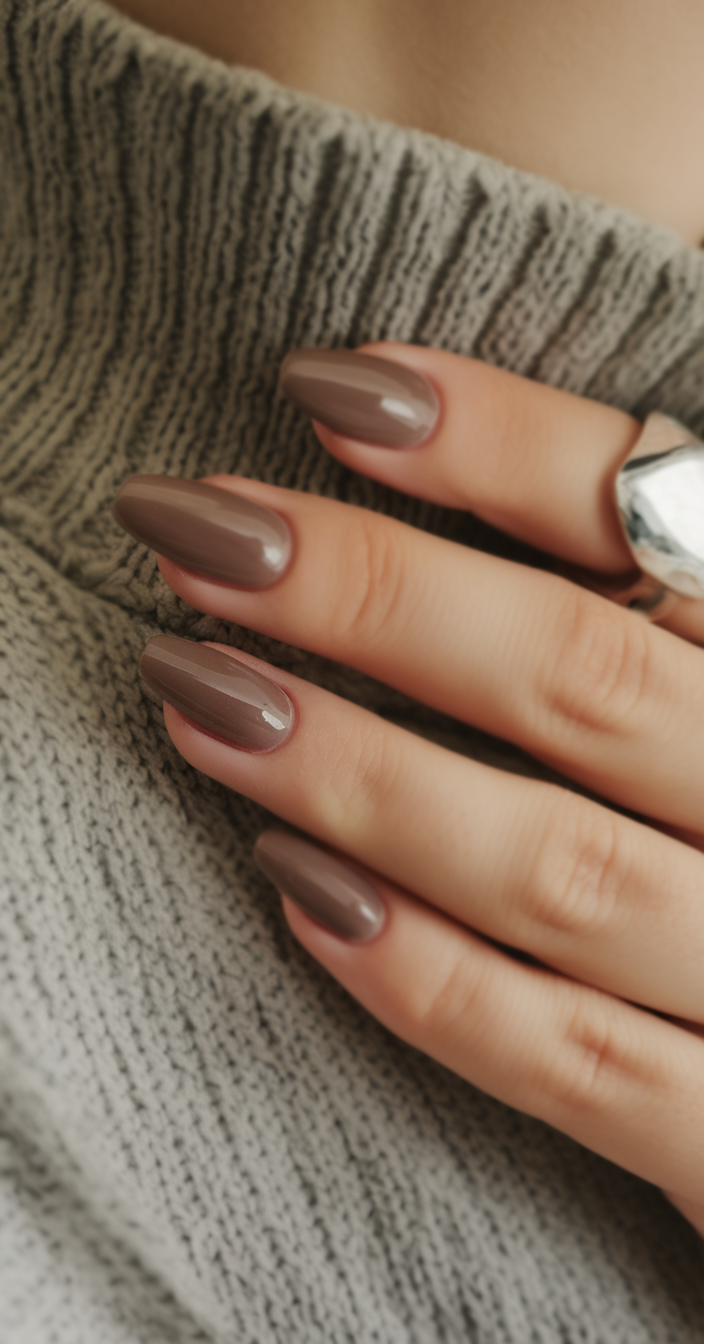 This acrylic almond manicure in a taupe shade exudes sophistication with its smooth, high-gloss finish. The muted tone is a perfect spring 2025 choice for those who love understated elegance. The spring almond shape enhances the natural length of the nails, making them look polished and refined. A versatile option that complements any style effortlessly.