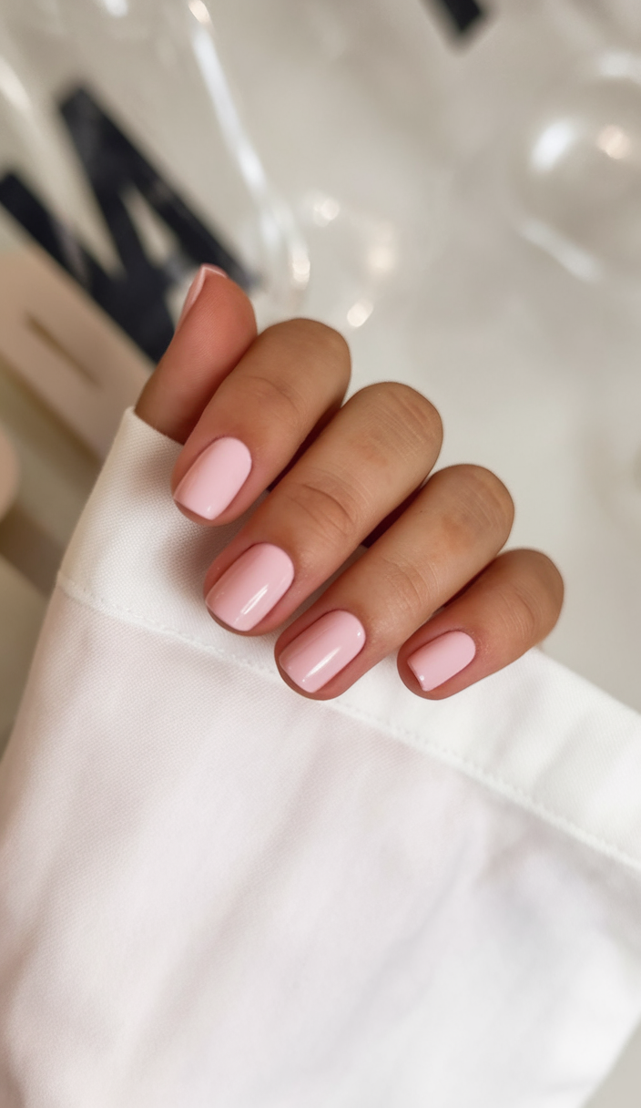 This spring short square manicure features a delicate pastel pink shade with a glossy, polished finish. The simple short acrylic design enhances the natural nail shape, making it an elegant and effortless choice. A timeless and refined option for spring 2025, this look is perfect for those who prefer understated beauty. A versatile manicure that pairs well with any outfit.
