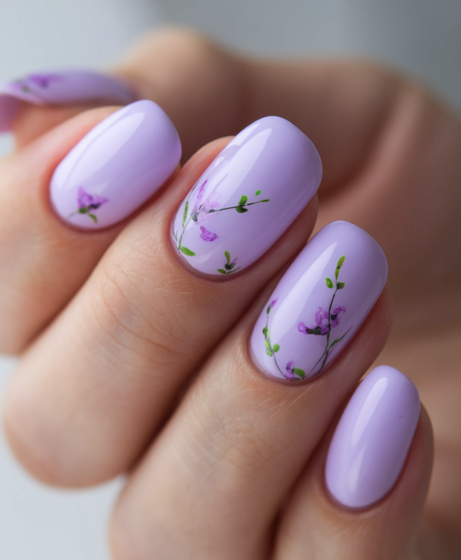 This spring short almond design features a delicate lilac base with hand-painted floral details for a fresh, nature-inspired touch. The subtle contrast of green stems and tiny purple flowers makes this style both elegant and feminine. A simple short acrylic manicure like this is perfect for those who prefer soft yet artistic nail looks. The rounded shape adds to the effortless beauty of this spring 2025 trend.