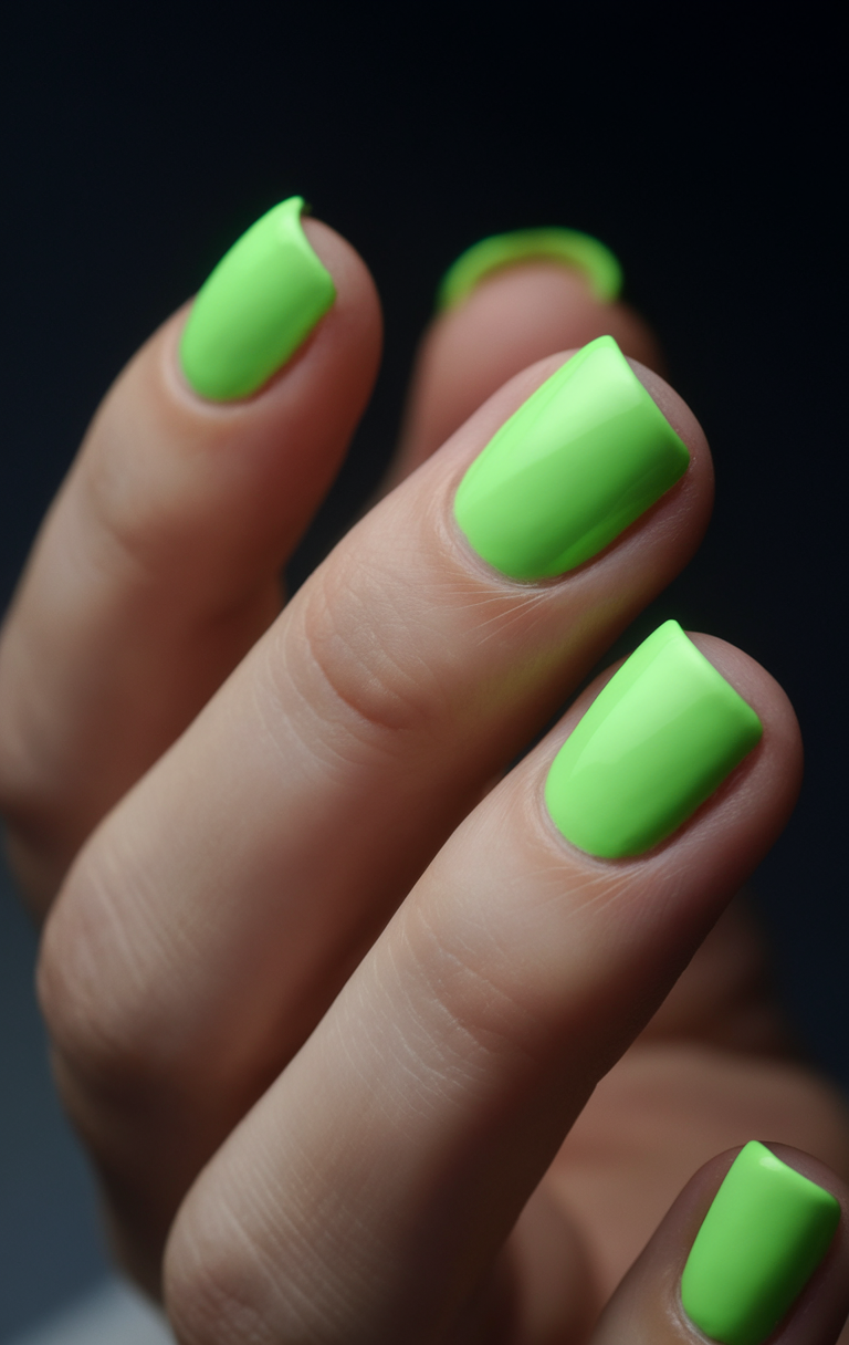 A vibrant spring short almond manicure, this look features a striking neon green shade with a glossy finish. The simple short acrylic design enhances the boldness of the color while keeping the nails modern and chic. This statement-making hue is a standout trend for spring 2025, adding an energetic and fresh touch to any look. A perfect choice for those who love bold and playful nail styles.