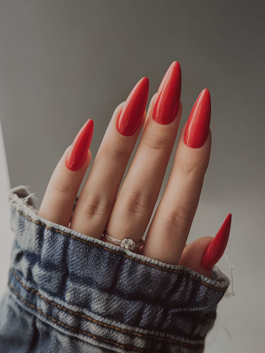 This acrylic almond manicure features a rich, fiery red shade that exudes confidence and elegance. The spring almond shape elongates the nails, creating a sleek and dramatic effect. The glossy finish enhances the boldness of the color, making it a perfect statement nail for spring 2025. A classic and powerful look for those who love timeless beauty.