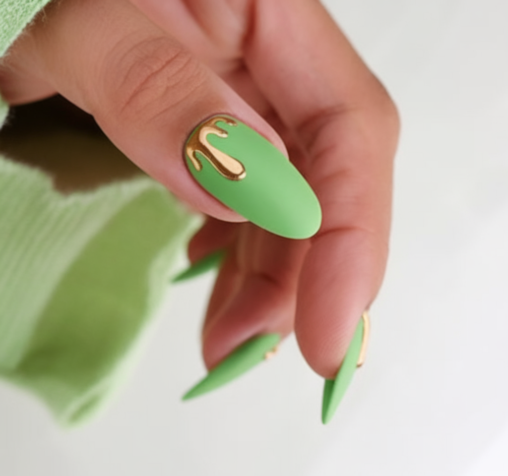 This spring matte manicure features a soft green shade with a luxurious gold drip design on the accent nail. The acrylic almond shape adds elegance, while the matte finish gives the nails a trendy and modern feel. A perfect blend of bold color and refined details, making it a standout choice for spring 2025. Ideal for those who love a mix of sophistication and creativity.