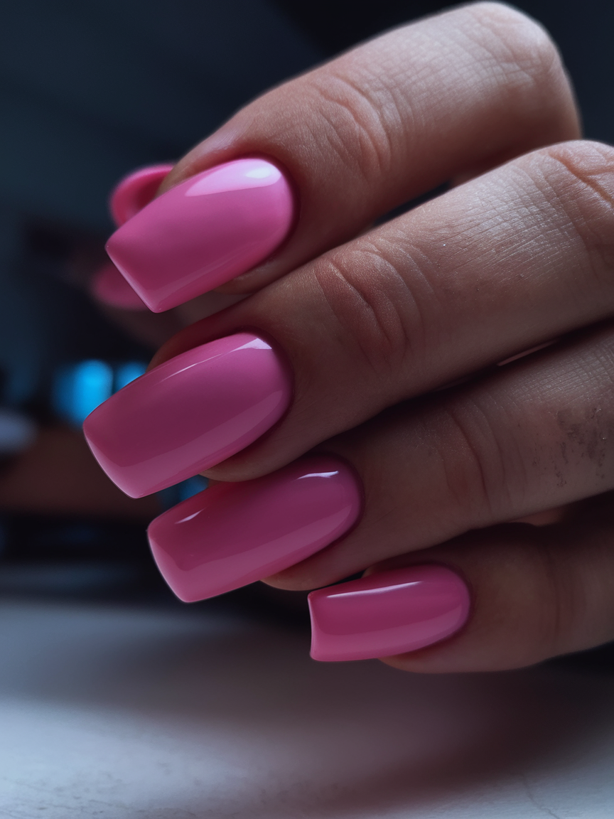 A classic acrylic square design, this manicure showcases a bold pink shade with a sleek, high-shine finish. The spring pink color is vibrant and youthful, adding a fresh touch to any look. The simple short acrylic structure keeps it stylish while ensuring durability. A go-to choice for spring 2025, offering both elegance and confidence.