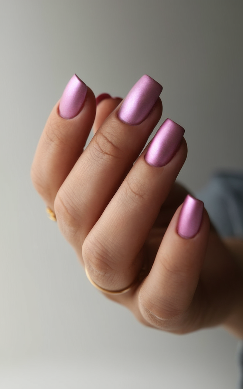 This spring short square manicure features a shimmering metallic pink shade with a smooth, velvety finish. The acrylic square shape keeps the look modern and practical while adding a touch of glamour. A perfect choice for spring 2025, offering a trendy yet refined appearance. Ideal for those who love a mix of boldness and sophistication.