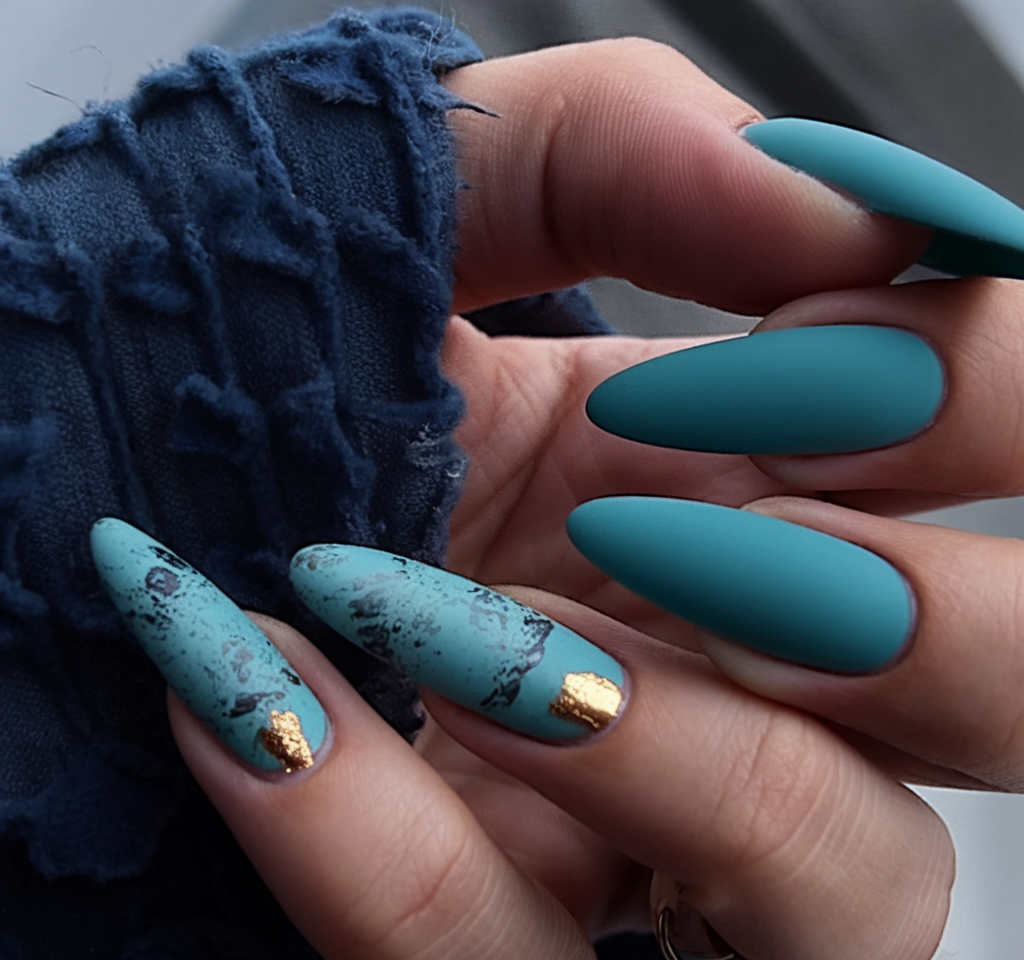 #4 Matte Teal Almond Nails with Gold and Marble Accents