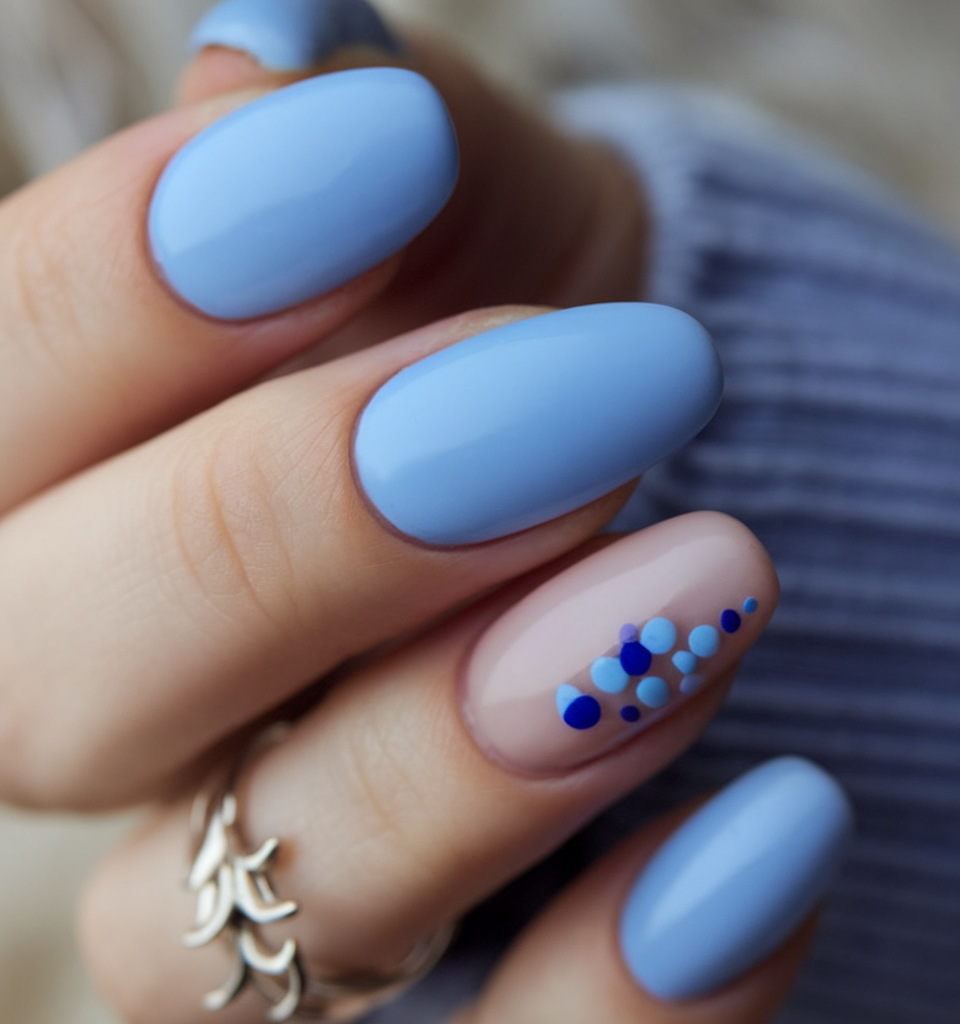 #3 Soft Blue Almond Nails with Abstract Dot Design