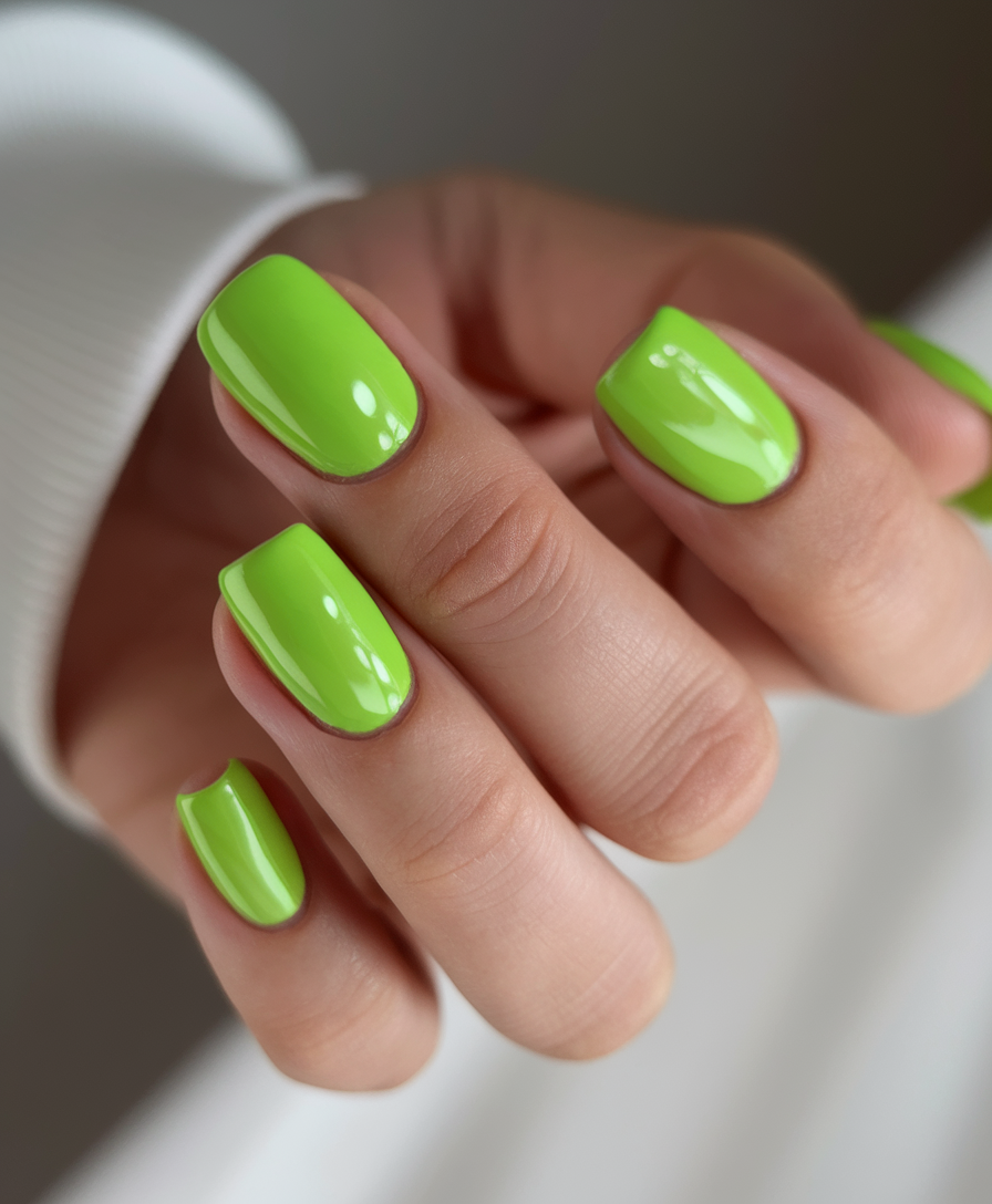 A bold and eye-catching spring short square look, this manicure features a striking neon green shade. The simple short acrylic design adds vibrancy while keeping the nails practical and stylish. The smooth, high-gloss finish enhances the bold color, making it a standout trend for spring 2025. A daring choice for those who love modern and edgy nail styles.
