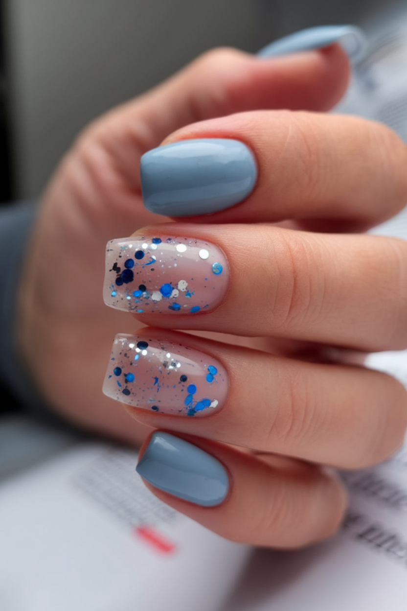 A modern take on spring short square nails, this manicure combines a soft pastel blue with a single accent nail covered in blue and silver glitter. The square shape keeps it stylish yet practical, perfect for everyday wear. This simple acrylic square look is both versatile and trendy, making it a great choice for those looking for something fresh this spring 2025. The mix of solid color and glitter creates a unique yet balanced effect.