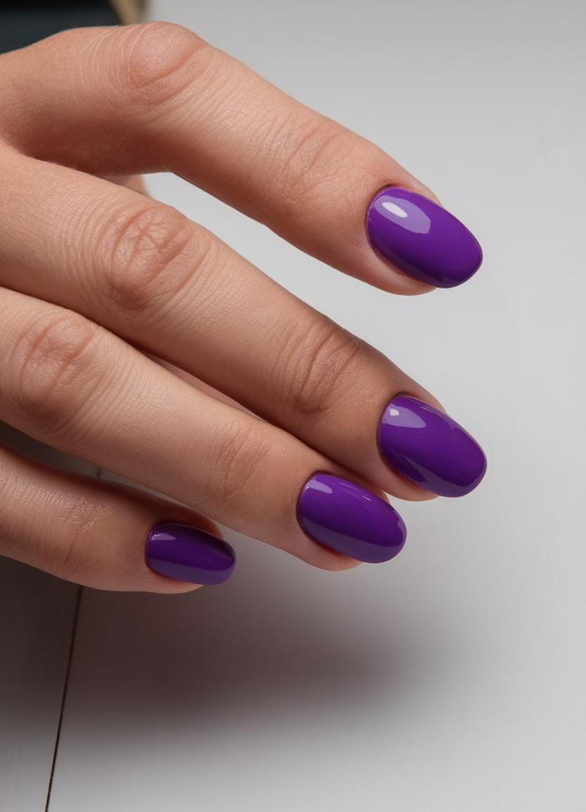 This spring short almond manicure features a rich, glossy purple shade that is both bold and elegant. The simple short acrylic design enhances the natural shape of the nails while providing a smooth, even finish. The deep purple hue is a striking choice for spring 2025, offering a refined yet eye-catching look. Perfect for those who love a minimalist yet sophisticated nail style.