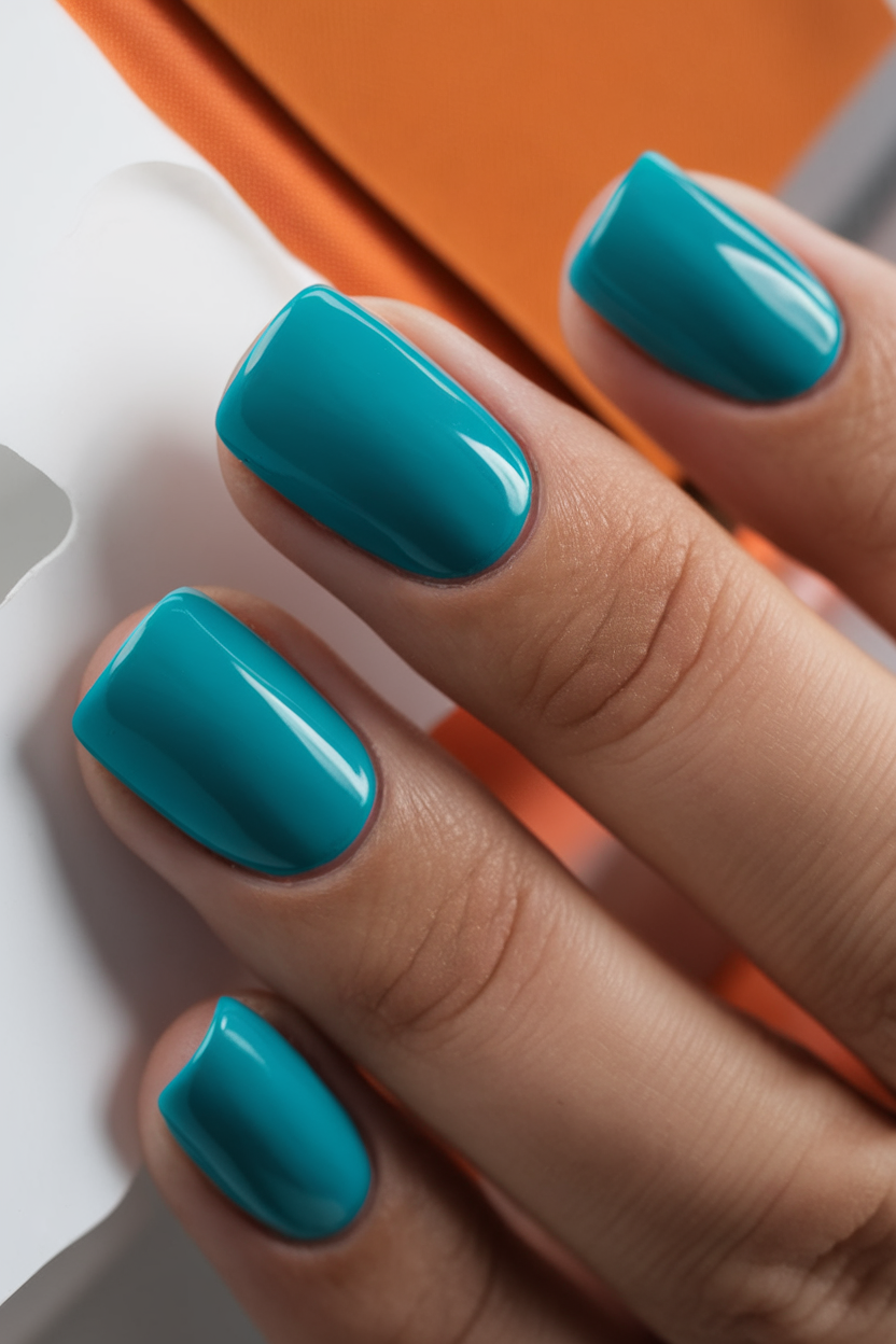 A fresh and modern take on spring short square nails, this manicure features a vibrant teal shade. The acrylic square shape gives a clean and structured look while keeping the nails practical for everyday wear. The high-gloss finish enhances the intensity of the color, making it a perfect choice for a statement nail style. This simple short acrylic look is trendy yet timeless for spring 2025.
