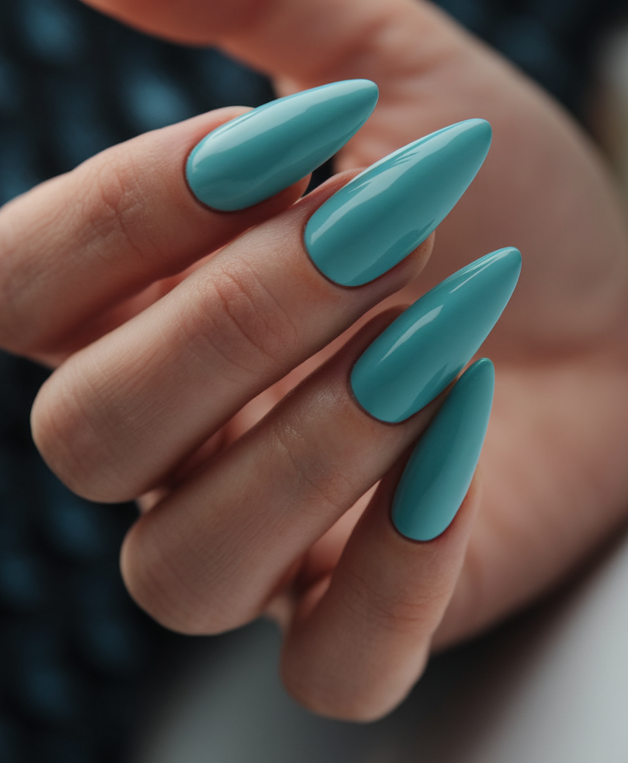 A soft and fresh take on spring almond nails, this design features a pastel blue shade with a glossy finish. The acrylic almond shape elongates the fingers, adding a graceful touch to the manicure. The smooth and even color application makes this style a simple yet chic choice for spring 2025. This look is ideal for those who prefer a minimal yet stylish nail design.