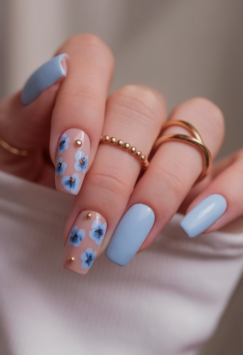 This acrylic square design combines solid pastel blue with delicate floral details for a romantic touch. The spring short square shape keeps the nails practical while maintaining a stylish appearance. The hand-painted blue flowers and gold embellishments add an artistic and feminine feel. A perfect spring 2025 choice for those who love soft and elegant nail art.