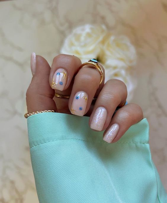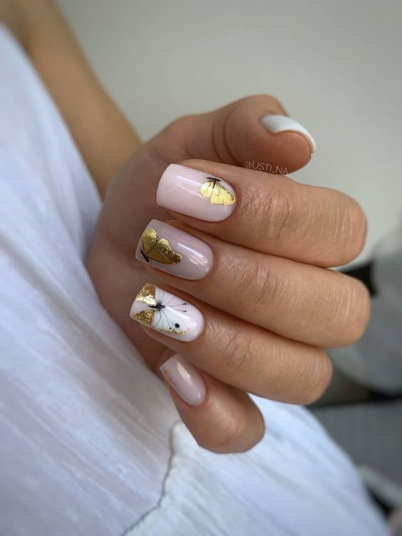 For a touch of luxury and whimsy, look no further than these pink nails adorned with golden butterfly wings. The combination of a simple base with intricate gold foil accents creates a cute and elegant design that can transition from day to night. These short nails are a perfect match for flowy summer dresses and golden jewelry, encapsulating a sense of bright, inspirational beauty.