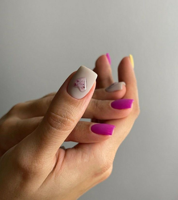 For those who love to make a statement, abstract patterns in neon pink and yellow against a nude base are a testament to the fun and artistic side of 2024. These gel short square nails are like wearing a piece of modern art, suitable for the bold at heart. They pair exquisitely with block color outfits, allowing your nails to do all the talking.