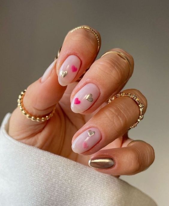 Love is always in the air with these charming nails that feature tiny hearts and gold accents on a sheer pink base. This cute and simple design is ideal for those romantic summer evenings or a daytime date at a beachside café. The gel short style ensures a comfortable fit for any activity, while the subtle design speaks to the trends of colors 2024, blending classic motifs with modern flair.