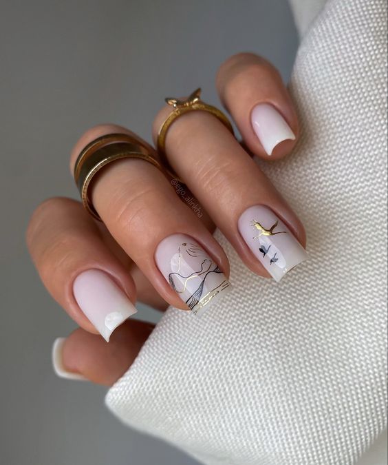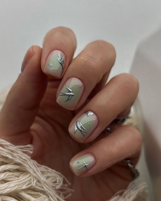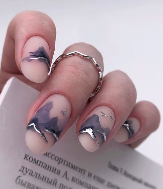 For those inspired by nature’s majesty, these nails offer a serene landscape of mountain silhouettes enveloped in mist. The muted tones and delicate silver foil reflect the tranquil beauty of a mountain retreat. These short nails are perfect for the nature-loving fashionista, blending art with the understated elegance of the 2024 gel short square trend.