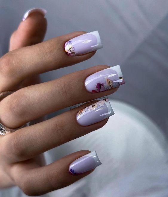 Summer is the season of blooms, and these square nails capture the delicate essence of flowers paired with gold foil. The soft purple backdrop provides a canvas for the floral art, creating a luxurious and romantic vibe. Whether paired with a flowing dress or a sharp suit, these nails add a touch of inspiration and art to any outfit, reflecting the 2024 color trends with grace.