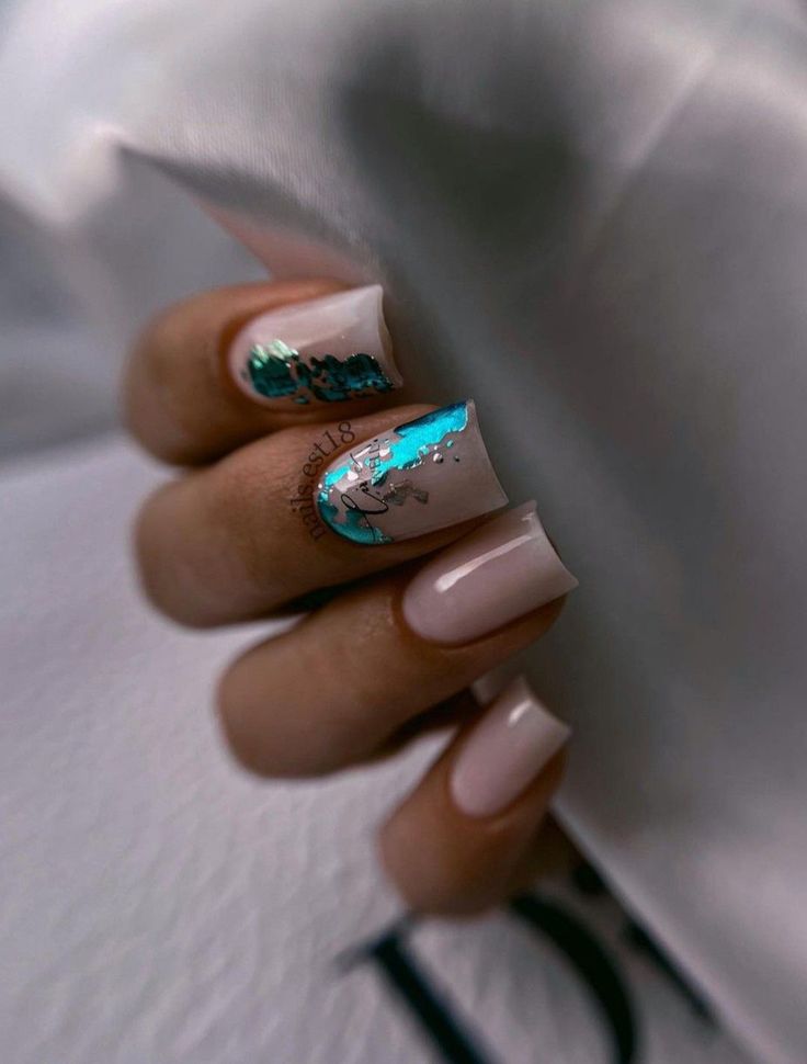 The glistening turquoise set against a soft matte base captures the essence of ocean waves lapping at the shore. This nail art design, with its sparkling fragments, evokes memories of sunny days by the sea. It’s a perfect design for the beachgoer who wants to carry the ocean’s tranquility with them.