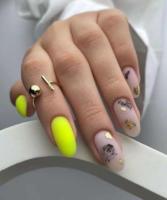 Neon is back with a bang, and these nails tell the tale with their neon yellow and soft pink palette. Adorned with gold flecks and whimsical face illustrations, this design is a conversation starter. It’s perfect for the bold fashionista ready to make a statement at summer festivals or late-night soirees.