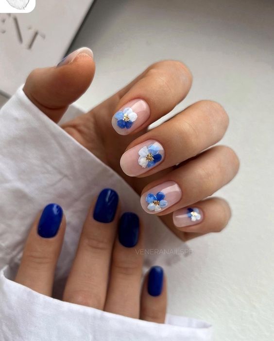 Floral motifs continue to bloom in the realm of nail art designs, with blue flowers and golden centers adding a pop of color to a translucent pink base. These gel almond nails are a nod to the bright and fun aspects of summer, serving as a stunning complement to a sundress or a casual denim look. The designs 2024 showcase an evolution towards more playful and vibrant expressions of personality.
