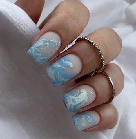 Dive into the deep blue of ocean-inspired nails that speak to the adventurer within. The artistry of wave patterns in shades of blue and white brings the sea to your fingertips. Each nail depicts a different crest and trough, reminiscent of the ebbs and flows of the tides. Pair these with a crisp white linen dress and strappy sandals for a look that’s effortlessly trendy.