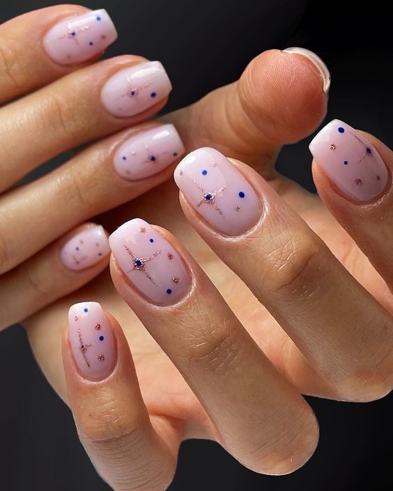 There’s something utterly magical about a clear summer night sky, and these nails bring that magic to your fingertips. Tiny constellations and stars scattered across a pale pink base create a celestial theme. The minimalist approach with touches of blue accents offers an easy, yet inspiring design, perfect for those warm, quiet summer evenings when the sky is clear and the stars are bright.