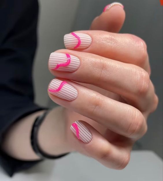 Stripes never go out of style, but this summer, they’ve gotten a bright, neon twist. Clean white lines serve as a canvas for a bold streak of pink, providing a modern, yet playful look. These gel short square nails are a statement piece for any outfit, embodying both the fun and trendy vibe of the season. Pair them with a monochromatic outfit to let the nails stand out as a vibrant accessory.