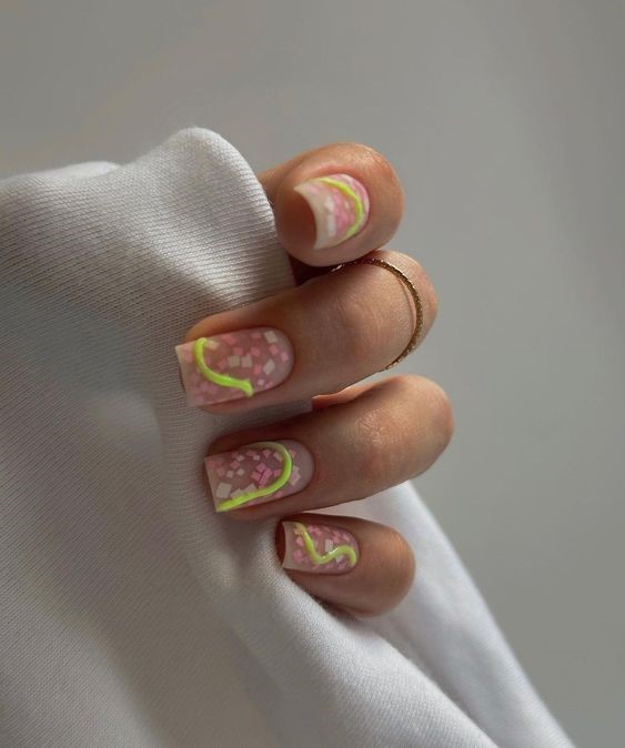 Geometric patterns paired with neon colors make for an electrifying combination. The interplay of pink and green on a sheer base is both fun and funky, offering a fresh take on 2024 gel short nails. This design screams inspo 2024 for those who love to mix and match patterns and hues, providing a bold statement to complement the bright colors of summer fashion.